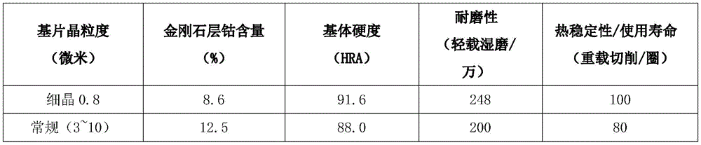 the catalyst-removing metal layer in the polycrystalline diamond layer comprises the following components in parts by weight: 1-5% of cobalt and 95-99% of diamond; the non-catalytic reduction metal layer in the polycrystalline diamond layer comprises the following components in parts by weight: 7-12% of cobalt and 88-93% of diamond;