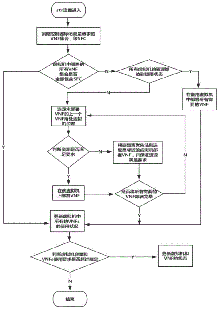 (2)当流量进入后,策略控制器根据请求的网络服务功能,将用户需要使用的网络服务功能标记成集合SFC={VNF1,VNF2,.....,VNFn},然后策略控制器根据NFV管理和编排组件提供的VNF信息,即虚拟机的集合VM={V1,V2,…,Vn}判断虚拟机的集合VM中是否包含所有的VNF;如若是则执行步骤(8),否则继续执行步骤(3);(2) When the traffic enters, the policy controller marks the network service functions that the user needs to use into a set SFC={VNF 1 , VNF 2 ,..., VNF n } according to the requested network service functions, and then the policy The controller judges whether the set VM of virtual machines contains all VNFs according to the VNF information provided by the NFV management and orchestration components, that is, the set of virtual machines VM={V 1 , V 2 ,..., V n }; if so, execute the steps (8), otherwise continue to perform step (3);