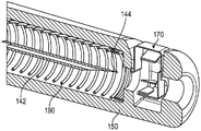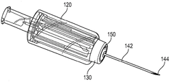 In a variation of this embodiment, as shown in fig. 61, there is a clip 170 mounted in the needle cannula housing's sleeve 150 adjacent the opening 155 in the distal end of the needle cannula housing that prevents the distal tip 144 of the needle cannula 142 from exiting the opening 155 when the needle cannula housing's sleeve 150 is in the fully extended position. In another variation of this embodiment, an outwardly projecting first projection 152a in the form of a rod extending from the needle cannula cover sleeve 150 engages with the second guide path 132 in the actuation member 195 in the form of a slot, guiding the needle cannula cover sleeve 150 as it slides within the housing 120. As shown in fig. 62, first guide pathway 131 and second guide pathway 132 form a Y-shaped slot at the distal end of actuating member 195. In another variation, the inner surface of the housing further comprises a guide track 165 that is keyed to a first protrusion 152a in the form of a protruding lever on the sleeve 150 of the needle cannula cover, preventing rotational movement of the sleeve 150 of the needle cannula cover relative to the housing 120.