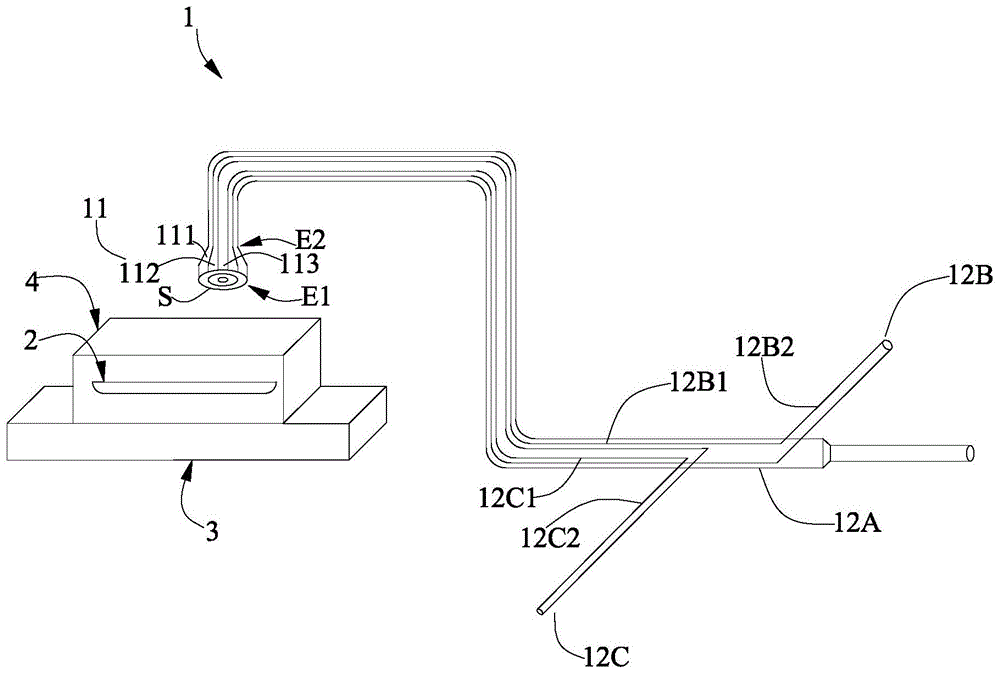 As shown in fig. 1, the third tube 12C includes a first segment 12C1 and a second segment 12C2 connected to each other, an end of the first segment 12C1 of the third tube 12C distal from the second segment 12C2 of the third tube 12C is connected to the third channel 113, and an end of the second segment 12C2 of the third tube 12C distal from the first segment 12C1 of the third tube 12C is connected to the component source 13C; the first section 12C1 of the third tube 12C is received within the first portion 12B1 of the second tube 12B, and the second section 12C2 of the third tube 12C is bent from the second section 12C2 of the third tube 12C and sealed through the first portion 12B1 of the second tube 12B and the first tube 12A.