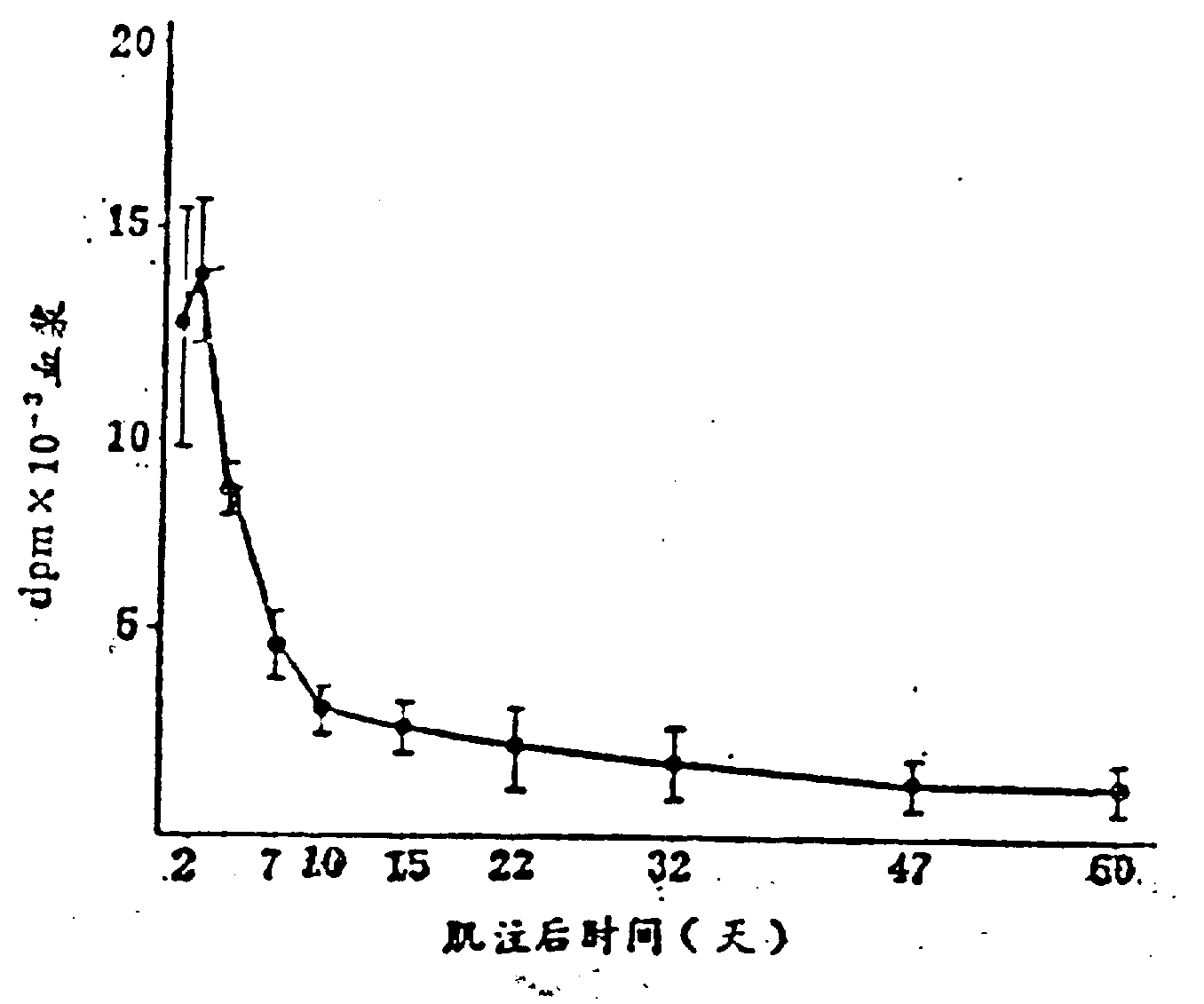 3H] testosterene undecannoata, blood plasma radioactivity peak appearred after 2 days, and the blood plasma radioactivity after 32 days and 60 days is respectively 13.3% and 9.9% of peak value, and radioactivity t1/2 β is 15.4 days.Distributing with liver, kidney, fat in the body is height, and levator ani, epididymis, prostate etc. take second place.Behind the medicine 60 days, intramuscular injection position residual activity was 19.9% of a dosage; Radioactivity accumulation excretion is respectively 41.9% and 9.3% of dosage in urine and the excrement.In urine, discharge the prototype medicine and account for 7.2%.The results are shown in Figure 2, table 6.