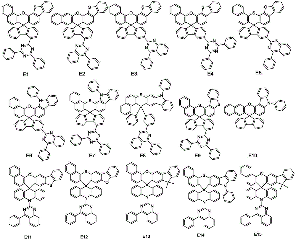 The current-voltage (J-V) characteristics of each OLED device were characterized by a characterization device, while recording important parameters such as efficiency, lifetime, and external quantum efficiency. Table 3 shows the OLED device lifetime and external quantum efficiency comparison, where lifetime LT95 is the time at which the luminance drops to 95% of the initial luminance @1000nits at constant current. Here, LT95 and the external quantum efficiency were calculated by comparing with example 35 (corresponding material TPBi), that is, the lifetime of comparative example 35 was 1 and the external quantum efficiency was 100. The lifetimes of examples 33 (corresponding to E2) to 34 (corresponding to E8) were all significantly higher than that of comparative example 35 (corresponding to TPBi). Therefore, the material of the invention is used as an electron transport layer material (ETM), the service life of the device is obviously prolonged compared with the service life of the existing electron transport material, and the device performance is obviously improved.