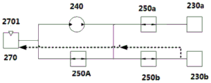 图14示意性地示出了尿道阻断器全部松开的流动状态。当需要排尿时,总电磁阀250A、第一尿道阻断器电磁阀250a和第二尿道阻断器电磁阀250b全部打开,第一尿道阻断器230a和第二尿道阻断器230b中的液体由于自身张力及来自膀胱的尿道内部压力作用下通过各电磁阀回流到储液囊270中,各尿道阻断器释放对尿道的压力,这时尿经过尿道排出体外。