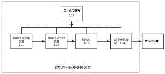 the electroencephalogram signal acquisition and processing device comprises an electroencephalogram signal acquisition device 101, an electroencephalogram signal processing device 102, an electroencephalogram library 103, a Wi-Fi transmission module 104 and a first power supply module 105, wherein the first power supply module 105 is respectively connected with the electroencephalogram signal acquisition device 101, the electroencephalogram signal processing device 102, the electroencephalogram library 103 and the Wi-Fi transmission module 104, and the electroencephalogram signal processing device 102 is respectively connected with the electroencephalogram signal acquisition device 101, the electroencephalogram library 103 and the Wi-Fi transmission module 104;
