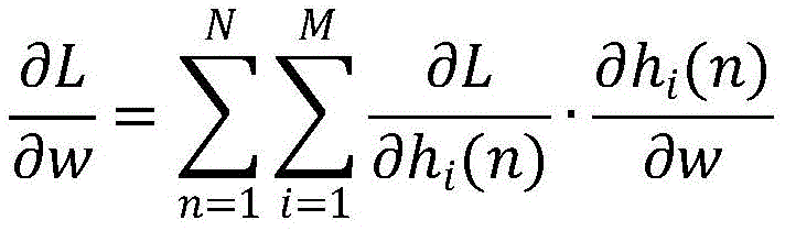 (2)令hi(n)为隐藏层第i个记忆单元的输出,M为记忆单元的长度,由链式法则得到全局化损失函数L对权重参数w的偏微分:(2) Let h i (n) be the output of the i-th memory unit in the hidden layer, M is the length of the memory unit, and the partial differential of the globalized loss function L to the weight parameter w is obtained by the chain rule: