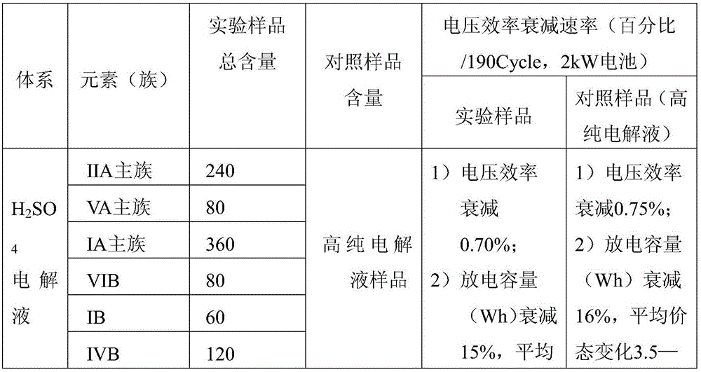 The data and results in table 2 show that in the H2SO4 system electrolyte, on the basis that the electrolyte properly adjusts impurity elements, compared with the electrolyte with greatly released element concentration, the battery with 10kW is used for comparative test of charge-discharge cycles, and after 170 charge-discharge cycles, the performance parameters such as efficiency and capacity attenuation of the experimental electrolyte system are superior to those of the control electrolyte.