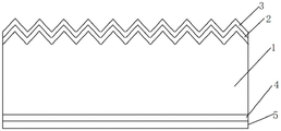 步骤(3)、在步骤(2)处理后的硅片的背面采用高温热扩散法制备p+发射极4。具体地,在常压管中,采用三溴化硼作为硼源,扩散温度为900℃,时间为80min,方阻为85Ω/sqr;扩散过程中,在p+发射极4的表面形成硼硅玻璃层5,其厚度为90nm。其中,步骤(2)中制备的氧化硅薄膜3能够阻挡硼原子对硅片前表面的n+前场2形成反掺杂。完成本步骤后的电池结构如图4所示。In step (3), a