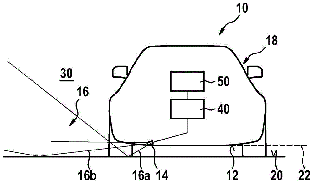 图1以正视图示出车辆10。该车辆具有构造为超声波传感器的声学传感器14,该声学传感器布置在车辆10的车底12上。受车辆束缚的声学传感器14这样固定在车辆10的车底12上,使得该声学传感器不超过车辆10的外轮廓18突出。声学传感器14相对于车辆10的车底平面22这样倾斜,使得由传感器14发送的声学信号16至少部分地被行车道表面20反射到车辆的周围环境30中。超声波传感器通常将声音发送到大致呈锥形的区域中。在该示图中,所发送的信号16通过限界声锥的线16a和16b示意性示出。由于所发送的信号16在行车道表面20上发生反射,声锥扩大,从而引起测量作用范围的提高。可以从整个声锥接收回波信号。回波信号返回到传感器14,其方式是,回波信号必要时再次在行车道表面20上发生反射。因此,所示系统例如感测车辆10的周围环境30中的对象和/或通过对由行车道20产生的回波信号进行分析评估来确定当前的行车道状态。为此,设置控制单元40,其构造为用于操控声学传感器14,以及设置计算单元50,其构造为用于分析评估所接收的声学回波信号并且根据所述分析评估确定周围环境30的至少一个特性。FIG. 1 shows the