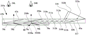 图21图示了根据本发明的透明基板的截面图,该透明基板包括耦进表面、两个耦出表面、角度敏感反射元件阵列以及重定向表面阵列;21 illustrates a cross-sectional view of a transparent substrate including an in-coupling surface, two out-coupling surfaces, an array of angle-sensitive reflective elements, and an array of redirecting surfaces in accordance with the present invention;