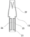 Referring to fig. 1 and 11, a heat exchange portion 23 for exchanging heat is disposed inside the suction nozzle 13, a cooling cavity 25 for filling cooling water is disposed in the heat exchange portion 23, a flue 26 for passing through the cigarette is disposed at an axial center of the heat exchange portion 23, the heat exchange portion 23 forms a filling opening on the surface of the suction nozzle 13, a soft plug 28 is disposed outside the suction nozzle 13, the soft plug 28 closes the filling opening, and after the suction nozzle 13 is inserted through the opening 101, the metal sheet 2 just adheres to the surface of the suction nozzle 13 and presses the soft plug 28; above-mentioned structure is mainly for cooling down to the cigarette after the evaporation, taste when increasing the absorption, and suction nozzle 13 all needs to wash every day, and in the time of the washing, extracts suction nozzle 13, then opens the filling opening, can replace the cooling water of inside filling. When in use, the soft plug 28 is pressed, so that the soft plug 28 can not be separated from the filling port, and the short circuit of the MCU caused after leakage is avoided.