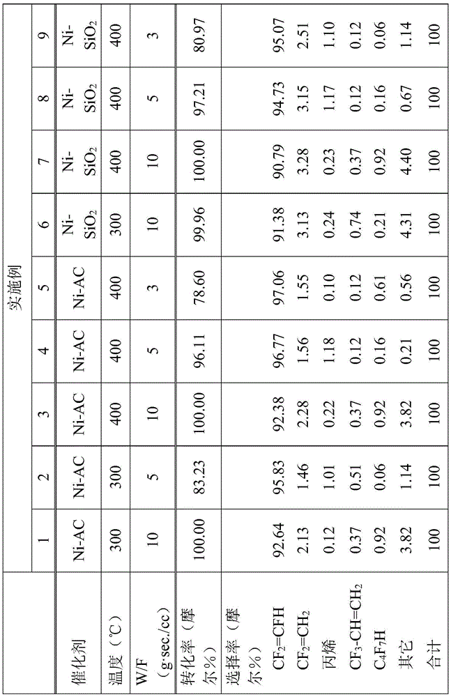 From the results of mass analysis and structure analysis, it was confirmed that CF was produced as the objective compound2CFH. The conditions and results of the catalyst, temperature and contact temperature are shown in table 1.