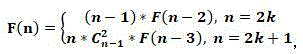 third stepAnd (5) after the selected initial vertex and the two selected vertices are removed, the number of the remaining vertices is n-3, namely 2(k-1), then the number of the remaining vertices is even, the analysis can be carried out by adopting the condition that n is even, and then F (n-3) possibilities are totally obtained in the third step. Thus, when n is an odd number, the recursive formula corresponding to the number of initial edge combinations is: