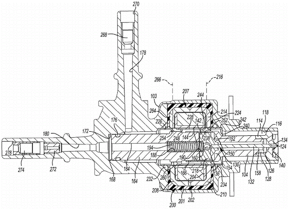 In some embodiments, the flux bridge 228' is made of a magnetic material (such as ferrite 430 stainless steel). In this embodiment, the flux bridge 228' is magnetic similar to the flux bridge collars 224, 226. As illustrated in fig. 5, constructing the previously described components from magnetic and non-magnetic materials, and positioning the magnetic materials adjacent to each other along lines 216 and 266, greatly improves the magnetic circuit performance associated with the electromagnet assembly 200. Benefits may include: the use of smaller coil wires, fewer turns of wire, and reduced amount of current provides an improved electromagnetic actuator having lower cost, reduced size and mass. Enhanced control over the position of the valve member 130 is also achieved. It should also be understood that the transverse plane defined by the ends of the cylindrical wire coil 202 and the plane containing the wires 216 and 266 may be interpreted as part of the magnetic circuit. At least one of these transverse planes passes through the pintle head 142, the flux bridge collars 224, 226, the flux bridge 228', and the enlarged diameter pole piece portion 260.