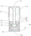 The atomizing base 20 is located on the side of the reservoir 13 away from the mouthpiece portion 11. Specifically, the housing 10 forms a receiving groove on a side of the liquid storage chamber 13 away from the mouthpiece portion 11, and the atomizing base 20 is disposed in the receiving groove. The atomizing base 20 includes an atomizing top base 21 and an atomizing bottom base 22. The atomizing top base 21 and the atomizing base 22 can be connected through a snap-fit structure. For example, a protrusion may be provided on the atomizing top base 21, and a slot may be provided on the atomizing bottom base 22; or a bulge is arranged on the atomizing base 22, and a clamping groove is arranged on the atomizing top seat 21. The atomizing base 20 can be made of ceramic, stainless steel or other alloys, and only needs to be capable of supporting; the shape and size of the atomizing base 20 are not limited and can be designed as desired.