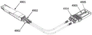 Alternatively, in some embodiments, and as shown in fig. 49B, multiple CS connectors 4906 are inserted into 200G transceiver module 4901. Then, each CS connector 4906 can be independently connected to 100, as shown in fig. 49A, and 200G transceiver module 4901 can receive MPO connector 4902. Additional tools (e.g., fan-out 4903 or cassette 4906) may then be used to disassemble the MPO connector. Once the cable is split, the cable may be connected to a 100G modular device (e.g., LC uniboost, as shown) 4904. Then, 100G module device 4904 may be inserted into 100G transceiver module 4905.