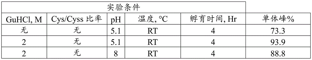 Several "redox agents" may additionally or alternatively be used, including the following pairs: cysteine/cystine, cysteine/cystamine, reduced glutathione/oxidized glutathione. Cysteine or reduced glutathione may also be used alone as they will produce oxidized forms, for example, at near neutral pH. It was surprisingly found that the use of cysteine and cystine significantly reduced aggregates. However, when cysteine and cystine were used, cysteinylation of two cysteines (one open disulfide bond) was observed. Preferably, the cystine concentration is about 1mM, and the cysteine concentration is n-fold higher relative to the cysteine concentration. For example, the cystine concentration may be in the range of 0.1mM to 10mM, preferably 1 mM. Cysteine: the cystine ratio may be any value from 1:1 to 33:1, preferably about 20: 1. Cystamine can be used in place of cystine at comparable concentrations and ratios. Reduced and oxidized glutathione may also be used in similar concentrations and ratios.