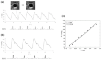 The pressure-radius relationship is obtained by time-aligning the radius curve (fig. 5a) and the pressure curve (fig. 5b) by means of an electrocardiogram, as shown in fig. 5 c. It is emphasized that the pressure and radius data for the entire time period, as well as the loading segment (i.e., the portion of the curve where both pressure and radius are in the ascending segment), can be extracted as raw data to fit the vessel-hardening parameters.