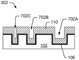 As shown at fig. 7B, the cavity 104 is partially filled with a conductive material 110 (e.g., copper alloy, etc.) using an superfill electroplating bath, or using a conformal electroplating or electroless plating bath, etc. In some embodiments, conductive layer 110 may be applied into chamber 104 by Physical Vapor Deposition (PVD) or by atomic layer deposition, chemical vapor deposition, or spin coating conductive layer 110 into chamber 104. The partial filling of the conductive layer 110 in the cavity 104 creates a conductive interconnect structure 114 having intentional openings 702 (e.g., 702A, 702B, and 702C) within the damascene cavity 104 (e.g., 104A, 104B, and 104C, respectively).