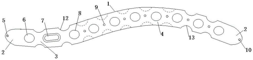 The clavicle middle section bone fracture plate shown in fig. 1-3 comprises a bone fracture plate body 1, wherein two ends of the bone fracture plate body 1 are fusiform structures 2, the top end of the fusiform structure 2 is arc-shaped, so that the bone fracture plate can be conveniently inserted, the operation of an operator is facilitated, soft tissue irritation is reduced, the edge of the bone fracture plate body 1 is of a smooth curved surface structure, the friction with the soft tissue is reduced, and postoperative discomfort is reduced, the middle of the bone fracture plate body 1 is of an S-shaped structure, the bone fracture plate body 1 is divided into a near-chest clavicular joint section 3 and a near-shoulder clavicular joint section 4, a near-chest kirschner wire hole 5, a near-chest locking hole 6 and a sliding hole 7 are arranged on the near-chest clavicular joint section 3, the near-chest kirschner wire hole 5 is arranged at the end part of the near-chest clavicular joint section 3, the near-chest locking hole 6 is arranged between the near-chest kirschner wire hole 5 and the sliding hole 7, and a near-shoulder locking hole 8 is arranged on the near-shoulder clavicular joint section 4, near shoulder Kirschner wire holes 9 are arranged between adjacent near shoulder locking holes 8, the near shoulder Kirschner wire holes 9 are mostly used for binding and fixing silk threads of small fracture blocks, can also be used for temporarily fixing forceps jaws of point type reduction forceps and can be matched with Kirschner wire holes far away from the fracture end for fine adjustment so as to achieve anatomical reduction and facilitate fracture recovery, near shoulder Kirschner wire holes 10 are arranged at the end parts of the near shoulder locking sections 4, the near shoulder Kirschner wire holes 10 and the near chest Kirschner wire holes 5 are matched so as to accurately position the near shoulder Kirschner wire holes on the bone surface, 4 through grooves are respectively formed at the two ends of the bone fracture plate body 1, the through grooves are uniformly formed at the two sides of the bone plate body 1 so as to facilitate the shaping of the two ends of the bone plate body 1 and make the bone plate more accord with the appearance of a clavicle, the through grooves are divided into near chest through grooves 12 and near shoulder through grooves 13, the near chest through grooves 12 are positioned at the two sides of the two ends of the sliding hole 7, the near shoulder through grooves 13 are positioned on two sides of a near shoulder Kirschner wire hole 10, the near shoulder locking holes 8 are 8, the near shoulder Kirschner wire holes 10 are 7, the near shoulder locking holes 8 and the near shoulder Kirschner wire holes 10 are distributed at equal intervals along a near shoulder locking segment 4, the near shoulder through grooves 13 are positioned on two sides of 2 near shoulder Kirschner wire holes 10 on the outermost side, the back of the near shoulder locking segment 4 is provided with arc-shaped grooves 11, the arc-shaped grooves 11 are symmetrically positioned on two sides of the near shoulder locking segment 4, the arc-shaped grooves 11 are distributed between a near chest through groove 12 and a near shoulder through groove 13 and are positioned on two sides of the near shoulder Kirschner wire holes 10, the depth is shallow, the curvature radius is larger, the plasticity of the fracture setting is improved, the stability and reliability of the whole structure of the bone fracture plate body 1 are ensured, the damage of the blood circulation around the cortical bone is reduced, the fracture of the chest is easier, the near shoulder locking holes 6 and the near shoulder locking holes 8 are full thread single holes, the contact area between the locking screw and the locking hole thread is increased, the angular stability of the bone fracture plate and the locking screw system is enhanced, meanwhile, adverse consequences of secondary fracture, bone damage and the like caused by inexperience of a clinical operating doctor are avoided, and iatrogenic injuries are avoided.