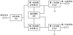 The boosting circuit 100 is connected to the first linear voltage stabilizing circuit 210 and the second linear voltage stabilizing circuit 310 respectively; the first linear voltage stabilizing circuit 210 is respectively connected with the communication module 400 and the first charging contact 220; the second linear voltage stabilizing circuit 310 is connected to the communication module 400 and the second charging contact 320, respectively.