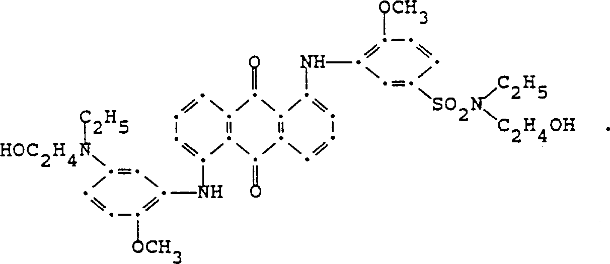 在优选的实施方案中,蓝色蒽醌化合物相应于上面结构式(I),其中R是氢;R1和R2独立地选自甲基和乙基:R3是氢、甲基或溴;R4是氢、C1-C4烷基或芳基;R5选自C1-C6亚烷基、C1-C4亚烷基-O-C1-C4亚烷基、-CH2C6H10CH2-、亚芳基或-CH2-亚芳基-,红色组分相应于式(V),其中R7是C1-C6烷氧基,R4和R5如权利要求1所定义。In a preferred embodiment, the blue anthraquinone compound corresponds to the above structural formula (I), wherein R is hydrogen; R and R are independently selected from methyl and ethyl: R is hydrogen, methyl or bromine; R 4 is hydrogen, C 1 -C 4 alkyl or aryl; R 5 is selected from C 1 -C 6 alkylene, C 1 -C 4 alkylene-OC 1 -C 4 alkylene, -CH 2 C 6 H 10 CH 2 -, arylene or -CH 2 -arylene-, the red component corresponds to formula (V), wherein R 7 is C 1 -C 6 alkoxy, R 4 and R 5 are as Claim 1 as defined.