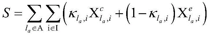 其中,la表示链路集合A中的第a条链路,所述链路集合A中包括所述每个边缘节点与所述中心节点之间的链路,I表示所述多个虚拟网络,i表示所述多个虚拟网络中第i个虚拟网络,表示la的边缘云节点的计算速率,表示所述中心云节点的计算速率,E表示所述多个边缘云节点所能承载的最大计算量之和,F表示所述中心云节点所能承载的最大计算量之和,表示la的边缘云节点对应的所述第一数据处理时延,表示所述中心云节点对应的所述第二数据处理时延,表示la对应的所述第一通信延迟,β为预设值,的取值为1或0,表示所述第i个虚拟网络部署在la的边缘云节点上,表示所述第i个虚拟网络部署在所述中心云节点上。Among them, l a represents the a-th link in the link set A, which includes the link between each edge node and the central node, and I represents the plurality of virtual networks , i represents the i-th virtual network in the plurality of virtual networks, Indicates the computing rate of the edge cloud node of la , Represents the computing rate of the central cloud node, E represents the sum of the maximum amount of computation that the multiple edge cloud nodes can carry, and F represents the sum of the maximum computation that the central cloud node can carry, Indicates the first data processing delay corresponding to the edge cloud node of la , Indicates the second data processing delay corresponding to the central cloud node, Indicates the first communication delay corresponding to la , β is a preset value, The value of is 1 or 0, Indicates that the i-th virtual network is deployed on the edge cloud node of la , Indicates that the i-th virtual network is deployed on the central cloud node.