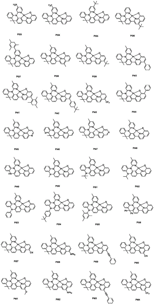 本发明的有益效果在于:与双齿配体铂配合物相比,本申请基于四齿配体的环金属铂(II)配合物分子刚性强,可有效抑制由于分子振动而产生的非辐射跃迁,量子效率会大大提高,同时四齿配体利于提高材料分子的化学稳定性和热稳定性。本发明通过改变围绕金属中心的配体结构以及调控配体上的取代基结构来调节金属铂配合物的光物理学性质。在OLED显示和照明等诸多领域具有广阔的应用前景。The beneficial effect of the present invention is that compared with the bidentate ligand platinum complex, the tetradentate ligand-based cyclometal platinum (II) complex of the present application has strong molecular rigidity, and can effectively suppress the non-radiative transition caused by molecular vibration. , the quantum efficiency will be greatly improved, and the tetradentate ligand is beneficial to improve the chemical stability and thermal stability of the material molecules. The invention adjusts the photophysical properties of metal platinum complexes by changing the ligand structure around the metal center and regulating the substituent structure on the ligand. It has broad application prospects in many fields such as OLED display and lighting.