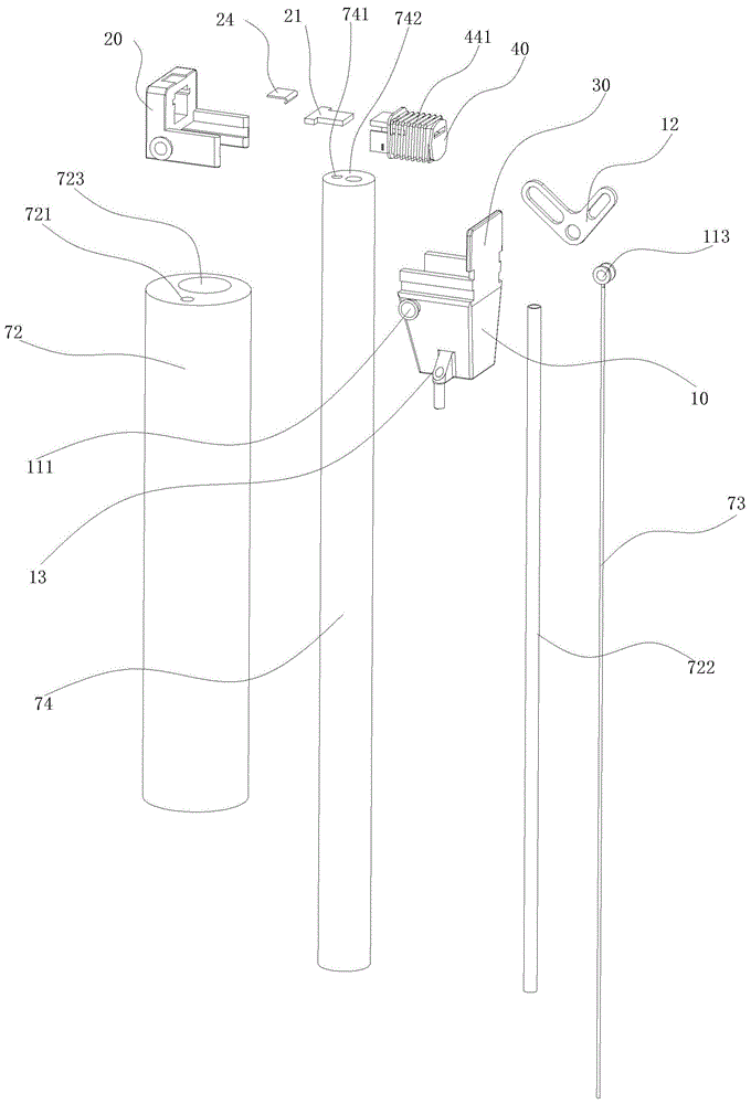 In this embodiment, the push-pull member 73 is made of a guide wire having a certain elasticity and rigidity, and the endoscope tube 74 is built in the second guide cavity 723. The guide tube 72 is flexible, can be bent and is not easy to deform, and can be integrally formed by a high-elasticity material, or a pipeline embedded with a spring, or other pipeline parts meeting the requirement of elastic performance. The first guide cavity 721 functions as a guide and a limit, and is configured to allow the push-pull member 73 to be bent in a flexible manner in a bending state, thereby effectively transmitting a pushing force.