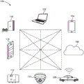 As shown in fig. 1, edge cloud computing network 100 includes a plurality of edge cloud computing devices, such as laptop 102, tablet PC 104, central "cloud" 106, car infotainment system 108, security camera 110, server computing device 112, mobile device 114, and game console 116. In an exemplary embodiment, each edge cloud computing device may be configured to act as a client or server as needed by the edge cloud computing network 100. Further, fig. 1 shows the connections or communication paths between the edge cloud computing devices as dashed lines. As will be appreciated by those skilled in the art, this architecture does not follow a conventional client-server model, in which one or more devices are designated to always act as a "server" and other devices always act as "clients".
