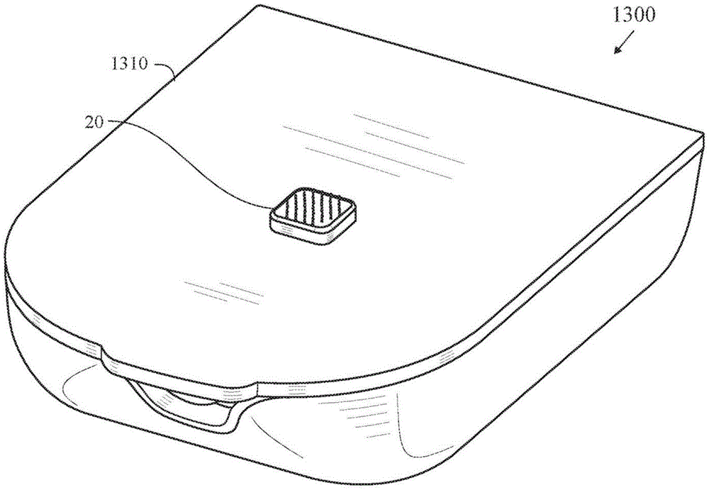 Fig. 13-15 illustrate an insulin patch pump 1300 having a body 1305 with a fully integrated microarray sensor 20 in a bottom surface 1310.