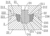 the end rubber sleeve middle die 22 comprises an end rubber sleeve middle die body 222 which is annular, a second annular table 221 is formed by protruding the inner wall of the middle part of the end rubber sleeve middle die body 222, the inner wall of the second annular table 221 is used for forming a second circumferential surface 204 of the end rubber sleeve 2, the bottom surface of the second annular table 221 is used for being matched with a sixth plane section 235, the inner wall area of the end rubber sleeve middle die body 222 on the lower side of the second annular table 221 is a third inclined surface section, the inner wall area of the end rubber sleeve middle die body 222 on the upper side of the second annular table 221 is a fourth inclined surface section, and the third inclined surface section is used for being matched with a third conical surface section 236;
