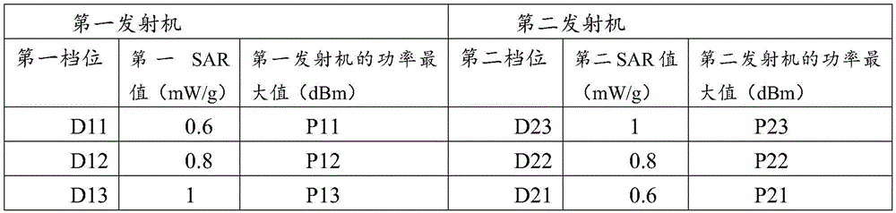 Alternatively, the above-described gear correspondence may be obtained through experiments. Taking the gear corresponding relation shown in table 2 as an example, the power range of the first transmitter is divided into three gears D11, D12 and D13 from small to large, and the upper limit values of the transmission power of the three gears are P11, P12 and P13 in sequence. When the transmission power of the first transmission is P11, the SAR value corresponding to the first transmitter is tested to be 0.6mW/g, and the SAR value of the antenna of the second transmitter cannot exceed 1mW/g according to the calculation of 1.6mW/g required by the regulation. Then, the SAR values at which the second transmitter transmits signals of different power values are set, and the power value P23 corresponding to the SAR value equal to or next to 1mW/g is found, taking P23 as the upper limit value of the power of D23 corresponding to D11. When the transmission power of the first transmission is P12, the SAR value corresponding to the first transmitter is tested to be 0.8mW/g, and then the SAR value of the antenna of the second transmitter cannot exceed 0.8mW/g according to the calculation of 1.6mW/g required by the regulation. Then, the SAR values at which the second transmitter transmits signals of different power values are set, and a power value P22 corresponding to the SAR value equal to or second only to 0.8mW/g is found, taking P22 as the upper limit value of the power of D22 corresponding to D12. When the transmission power of the first transmission is P13, the SAR value corresponding to the first transmitter is tested to be 1mW/g, and then the SAR value of the antenna of the second transmitter cannot exceed 0.6mW/g according to the calculation of 1.6mW/g required by the regulation. Then, the SAR values at which the second transmitter transmits signals of different power values are set, and the power value P21 corresponding to the SAR value equal to or second only to 0.6mW/g is found, with P21 as the upper limit value of the power of D21 corresponding to D13, thereby obtaining the above table 2.