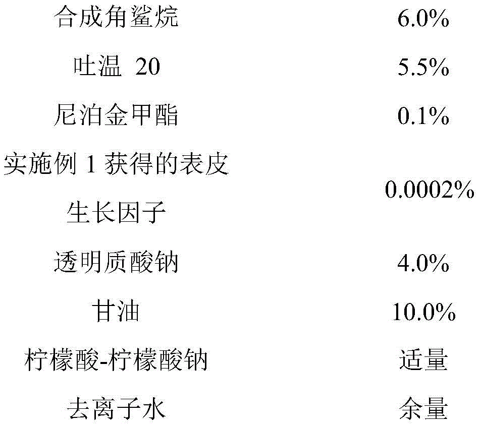 heating synthetic squalane, Tween 20, sodium hyaluronate, glycerol and deionized water to 70 deg.C, mixing thoroughly, cooling to about 40 deg.C, adding epidermal growth factor into polylactic acid powder (particle size 0.05-1 micrometer), mixing, adding into the mixture of synthetic squalane, Tween 20, sodium hyaluronate, glycerol and deionized water together with pH regulator and antiseptic, mixing well, and vacuum degassing.
