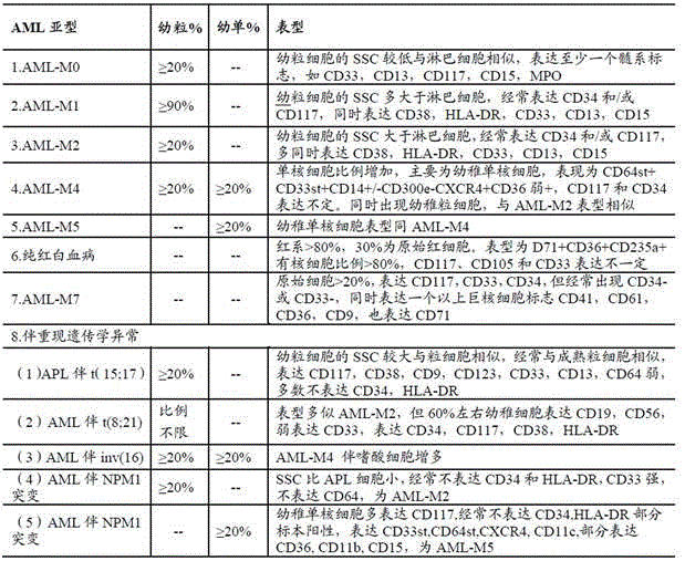 7. When the genotype is predicted and certain phenotypes are highly correlated with specific genetic abnormalities, the detection of these markers can predict whether the genetic abnormalities are present. Several AMLs with recurrent genetic abnormalities with typical phenotypic characteristics are listed in Table 6, wherein AML is accompanied by t (8;21) (q22; q 22); RUNX1-RUNX1T1 often appeared morphologically and immunophenotyped as AML-M2, naive myeloid cells in the immunophenotype often expressed CD34, CD117, CD38 and HLA-DR, how weakly CD33 was expressed, and around 60% abnormally expressed the B lineage associated marker CD19 and NK associated marker CD56, with AML companion T (8;21) (q22; q22) if these typical immunophenotypic characteristics were present; more than 90% of the genotypes of the leukemia, RUNX1-RUNX1T1 are related. For APL companion t (15;17) (q22; q 12); PML-RAR alpha genotype leukemia, the typical bone marrow morphology of patients often shows that the number of early and young granulocytes is increased obviously, and the cells have more granules; the immunophenotyping shows that the proportion of CD117+ naive cells is obviously increased, the value of the lateral angle light scattering (SSC) of the cells is larger, the immunophenotyping has the greatest characteristic that CD34 and HLA-DR are not expressed, the expression of CD33 is stronger, and CD9, CD123 and CD64 are expressed (weak), and the appearance of the phenotypic characteristic often indicates that APL accompanies t (15;17) (q22; q 12); PML-RAR alpha genotype leukemia. The NPM1 mutation has great similarity to APL, but low SSC and weak MPO expression can be identified.