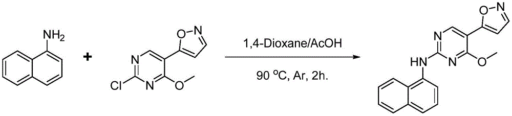 于5mL圆底烧瓶中加入1-萘胺(20mg,0.14mmol),5-(2-氯-4-甲氧基嘧啶-5-基)4-甲基异恶唑(47mg,0.21mmol),1,4-二氧六环2mL,冰醋酸1mL,对体系氩气置换3次,90℃反应2h,降至室温,乙酸乙酯萃取,柱层析(PE:EA=5:1),得到5-(4-甲基异恶唑-5-基)-4-甲氧基-N-(萘-1-基)嘧啶-2-胺30mg,收率64.7%,纯度95%。In a 5mL round-bottomed flask, 1-naphthylamine (20mg, 0.14mmol), 5-(2-chloro-4-methoxypyrimidin-5-yl)4-methylisoxazole (47mg, 0.21mmol) were added, 2 mL of 1,4-dioxane, 1 mL of glacial acetic acid, replaced the system with argon three times, reacted at 90°C for 2 h, cooled to room temperature, extracted with ethyl acetate, and subjected to column chromatography (PE:EA=5:1) to obtain 5-(4-Methylisoxazol-5-yl)-4-methoxy-N-(naphthalen-1-yl)pyrimidin-2-amine 30 mg, yield 64.7%, purity 95%.
