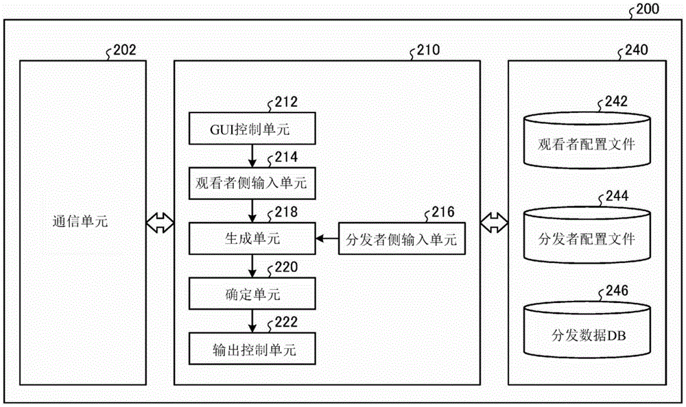 The control unit 210 is a controller, and is realized, for example, in response to various programs stored in the ROM or the like of the server 200 that are executed by the CPU, MPU, or the like using the RAM as a work area. Specifically, as shown in fig. 6, the control unit 210 may include a GUI control unit 212, a viewer-side input unit (first acquisition unit) 214, a distributor-side input unit 216, a generation unit 218, a determination unit 220, and an output control unit (first distribution unit) 222.