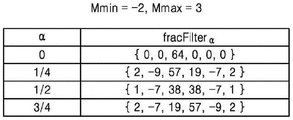 Fig. 7a to 7e are tables showing filter coefficients of a filter for determining pixel values at fractional pixel positions and gradient values in horizontal and vertical directions of a fractional pixel unit according to an embodiment.