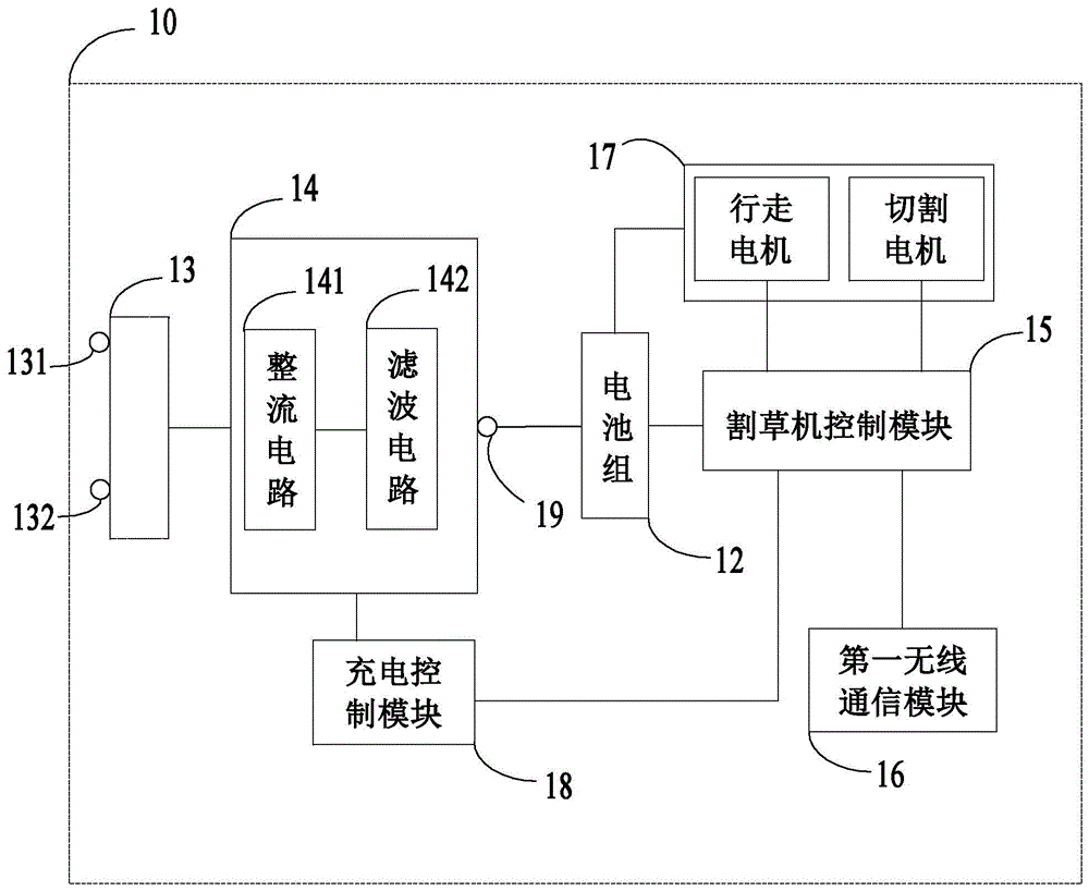 图2示出了作为实施例之一的智能割草机10的电路框图。如图2所示,智能割草机10包括:充电接口13、充电电源电路14、电池组12、割草机控制模块15、第一无线通信模块16、驱动模组17和充电输出接口19。Fig. 2 shows a circuit block diagram of an