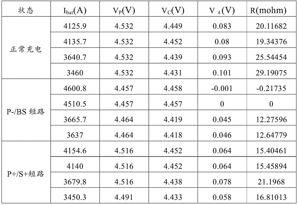通过检测到的第一电压、第二电压及电池电流,计算得到电池保护板的阻抗R,若连续10次R<R预,则可以判定电池BTB连接器存在短路,否则,电池BTB连接器未短路。如下表为实际项目验证结果The impedance R of the battery protection board is calculated by the detected first voltage, second voltage and battery current. If R<R for 10 consecutive times, it can be determined that there is a short circuit in the battery BTB connector; otherwise, the battery BTB connector is not connected. short circuit. The following table shows the actual project verification results