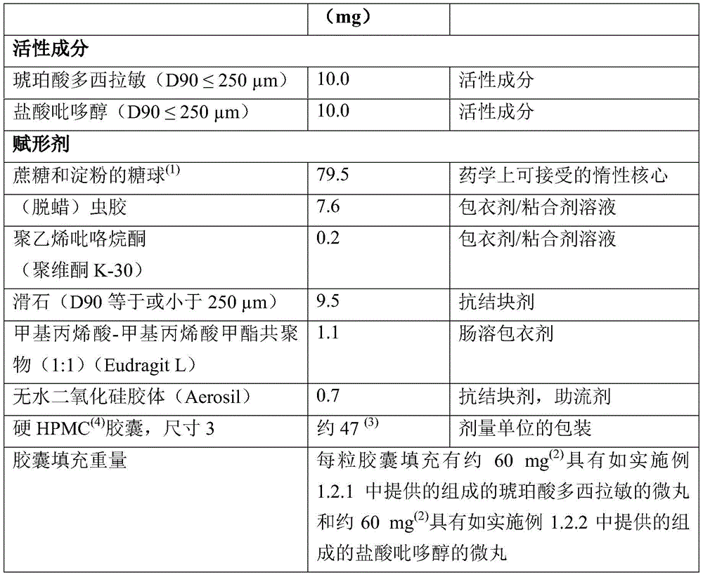 另一方面,填充有琥珀酸多西拉敏改进释放微丸和盐酸吡哆醇改进释放微丸的硬胶囊以Cariban的名称销售(益利巴萨妇科(INIBSA):“SPC Cariban 10mg/10mg改进释放胶囊”,互联网引用,2016年3月1日,获得自以下URL地址:https://inibsa.com/wp-content/uploads/2016/10/En-spc-V1.pdf,在2019年3月7日检索)。Cariban用于恶心和呕吐的对症治疗。事实上,Cariban适用于对保守治疗无反应的妊娠期恶心和呕吐(nausea and vomiting during pregnancy,NVP)的对症治疗。特别地,多西拉敏和吡哆醇的作用在摄入五小时后开始显现,这是有利的,因为能够延长治疗效果并减少药物摄入量。多单位剂型的治疗效果取决于每个微丸中活性成分的溶出曲线(dissolutionprofile),进而取决于微丸间的均质性。On the other hand, hard capsules filled with doxylamine succinate modified-release pellets and pyridoxine hydrochloride modified-release pellets are marketed under the name Cariban (INIBSA Gynecology). ): "SPC Cariban 10mg/10mg Modified Release Capsules", Internet Citation, March 1, 2016, obtained from the following URL address: https://inibsa.com/wp-content/uploads/2016/10/En-spc -V1.pdf, retrieved March 7, 2019). Cariban is used in the symptomatic treatment of nausea and vomiting. In fact, Cariban is indicated for the symptomatic treatment of nausea and vomiting during pregnancy (NVP) unresponsive to conservative treatment. In particular, the effect of doxylamine and pyridoxine begins to appear five hours after ingestion, which is advantageous because the therapeutic effect can be prolonged and the drug intake can be reduced. The therapeutic effect of a multiple unit dosage form depends on the dissolution profile of the active ingredient in each beadlet, which in turn depends on the homogeneity between beadlets.