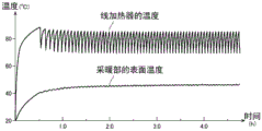 图5是表示向面状采暖工具100供给电源后的线加热器30的温度及采暖部10的表面温度的变化的一例的图。另外,图5所示的线加热器30的温度的上升和下降的周期与图4(c)所示的线加热器30的温度的上升和下降的周期相同,图5是将横轴的时间设定得比图4(c)的横轴的时间长的曲线图。图5所示的横轴的单位是小时[h(hour)]。FIG. 5 is a graph showing an example of changes in the temperature of the