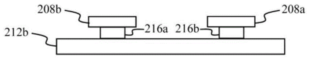 图2C示出了SMD装配件100的侧面212b,以及封装件耳部208b和208a。在一些实施例中,在SMD装配件100的侧视图和透视图中不可见的是耳部连接器216a和216b(统称为“耳部连接器216”),它们本身为矩形形状。耳部连接器216确保封装件耳部208与相应的侧面212间隔距离d,使得宽度为w的引线106能够围绕耳部连接器缠绕。在示例性实施例中,封装件102、四个耳部连接器216和四个封装件耳部208诸如通过注射成型或类似技术被形成为整体结构。Figure 2C shows