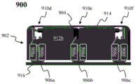 图9A-9B是根据示例性实施例的用于容纳多个双引线电子组件的SMD装配件900的代表图。图9A是SMD装配件900的透视图;图9B是SMD装配件的侧视图。在示例性实施例中,SMD装配件900也被称为水平SMD装配件。用于容纳多个双引线电子组件的垂直SMD装配件未在文中示出,尽管它可以共享SMD装配件900以及垂直SMD装配件300/600的特征。包含在SMD装配件900的封装件902中的三个双引线电子组件是MOV 904,尽管它们大部分从视图中被遮蔽。MOV 104的四个引线906a-d(统称为“引线906”)是可见的。在示例性实施例中,引线906被软化和弯曲以适应到封装件902中。9A-9B are representative views of an