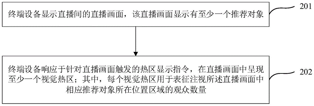 响应于针对所述直播画面触发的热区显示指令,在所述直播画面中呈现至少一个视觉热区,所述视觉热区用于表征注视所述直播画面中相应推荐对象所在位置区域的观众数量。Responsive to the hot zone display instruction triggered for the live screen, at least one visual hot zone is presented in the live screen, and the visual hot zone is used to represent the number of viewers watching the location area of the corresponding recommended object in the live screen .