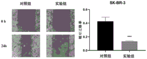 将乳腺癌细胞接种于六孔板中,体积为2mL/孔,待细胞贴壁后于实验组加入利用10%FBS培养基配制的重组XVII型人源化胶原蛋白进行共培养(图中标记为实验组),胶原蛋白终浓度为10mg/mL,对照组则加入10%FBS培养基(图中标记为对照组)。当每孔细胞铺满95%形成单层细胞时,用200μL移液枪枪头在单层细胞上呈“一”字划痕,用PBS清洗3次,继续于实验组加入利用无血清培养基配制的重组XVII型人源化胶原蛋白培养,胶原蛋白终浓度为10mg/mL,对照组则加入无血清培养基,培养箱孵育24h后吸去培养液,用PBS清洗3次后,在倒置荧光显微镜下观察并拍照,同时统计细胞相对迁移率。Breast cancer cells were inoculated in six-well plates with a volume of 2 mL/well. After the cells adhered to the wall, the recombinant XVII humanized collagen prepared with 10% FBS medium was added to the experimental group for co-culture (marked in the figure as experimental group), the final concentration of collagen was 10 mg/mL, and 10% FBS medium was added to the control group (marked as the control group in the figure). When the cells in each well are 95% full and form a single layer of cells, use a 200 μL pipette tip to make a "one" scratch on the monolayer of cells, wash with PBS for 3 times, and continue to add serum-free medium to the experimental group The prepared recombinant type XVII humanized collagen was cultured, the final concentration of collagen was 10 mg/mL, and the control group was added with serum-free medium. After incubation in the incubator for 24 hours, the culture medium was sucked off, washed with PBS for 3 times, and then placed in an inverted fluorescent tube. Observe and take pictures under a microscope, and count the relative migration rate of cells at the same time.