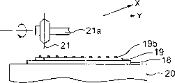 在粘性薄片18上得到的晶片被放在工作台20上,工作台20在Y方向上以步进方式移动,在行进到终点后转动90度,然后在相反方向上以步进方式移动。在工作台20上方设置转动刀片21,用于围绕转动轴21a转动,并在平行于工作台20表面的X方向上往复地运动。转动刀片21被提供用于冷却刀片21的冷却水和用于去除转动刀片21对半导体晶片19划片所产生微粒的清洗水。The wafer obtained on the