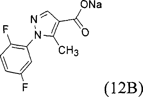 To a stirred solution of 1N HCl (500mL) was added sodium salt 12B (76.1g) in portions. After 1-2 hours, the product was collected by filtration and washed with ice-cold diluted HCl (0.1N) to give 1- (2, 5-difluoro-phenyl) -5-methyl-1H-pyrazole-4-carboxylic acid (12C) as a white solid (69.3g, 99.4%). HPLC retention time: 2.10 min; LCMS MH+=239.09;1HNMR(500MHz,DMSO-d6)δ12.56(s,1H),8.01(s,1H),7.60(m,2H),7.52(m,1H),2.38(s,1H)ppm。