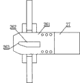 As shown in Fig. 6, Fig. 8 and Fig. 9, described moving knife drives the cylinder barrel of oil cylinder 27 to connect described shearing moving cutter 26, and described moving knife drives the piston rod of oil cylinder 27 to connect described stationary knife cutter hub 251; Described shearing stationary knife 25 comprises stationary knife cutter hub 251, run through described stationary knife cutter hub 251 and be provided with stationary knife guide hole 252, be positioned at described stationary knife guide hole 252 exits on described stationary knife cutter hub 251 and be provided with groove, cutter head 253 detachably is installed in described groove, and cutter head 253 is set to alloy material, and its intensity is greater than the intensity of stationary knife cutter hub 251, therefore contribute to improve the service life of shearing stationary knife 25, and after wearing and tearing occurring, only changed cutter head 253 and got final product, contribute to saving to reduce cost; Described shearing moving cutter 26 comprises moving knife cutter hub 261, runs through described moving knife cutter hub 261 and is provided with the shearing cylindrical void 262 corresponding with described stationary knife guide hole 252, and the interior edge of described shearing cylindrical void 262 is provided with the shearing arc edge 263 corresponding with described cutter head 253.