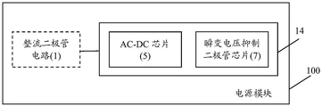 Fig. 4 is a circuit schematic diagram illustrating the power module 100 according to the present invention. As shown in fig. 4, the power module 100 of the present invention includes an AC-DC chip (or referred to as an IC power management chip) 5 and a transient voltage suppressing diode (TVS) chip 7. The AC-DC chip 5 may be provided with a plurality of pads and configured to perform management and control of the power module 100, while the TVS chip has a plurality of pins connected to the AC-DC chip. According to the present invention, the AC-DC chip 5 and the transient voltage suppression diode (TVS) chip 7 are integrated in a package 14 (e.g., a plastic package) having a plurality of pins, and the AC-DC chip 5 and the TVS chip 7 are connected to the associated pins of the package 14 through associated pads and pins, so as to realize power output, such as driving an LED circuit or charging an external portable device, in operation. In one embodiment, the rectifier diode circuit 1 (e.g., a high voltage rectifier bridge circuit) has a plurality of pins connected to the package 14 and is configured to convert an input ac power to a dc power.