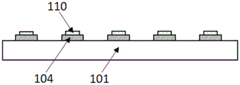 提供一显示背板101,所述显示背板101为薄膜晶体管(TFT,Thin FilmTransistor)背板;并在所述显示背板101上设置两个以上的金属焊盘组件104,其中,每个金属焊盘组件104均由两个金属焊盘组成,其分别为正极焊盘和负极焊盘;该金属焊盘由钛Ti、金Au、锡Sn、铜Cu、铟In、银Ag、铂Pt、铬Cr、镍Ni中的一种或几种金属通过涂胶、曝光、显影、刻蚀、剥离处理后所形成。A